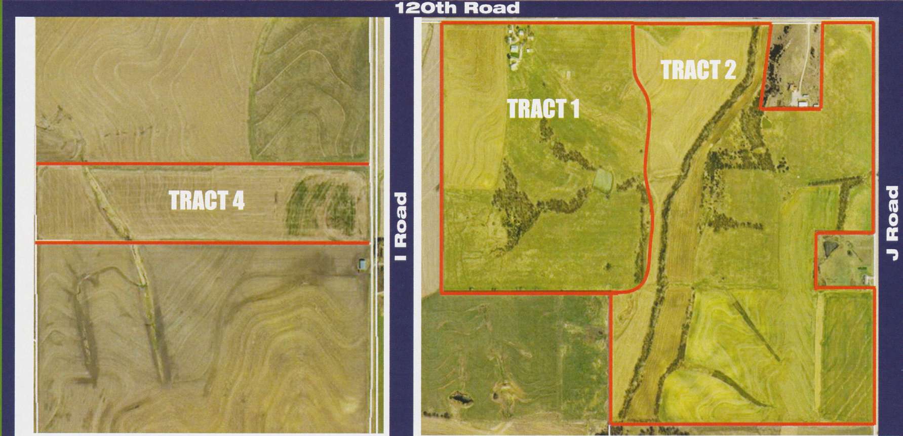pasture, waterways, creek and wildlife habitat. Tract 3 – A combination for Tracts 1 and 2. Tract 4 – Located West of tract 1 to I Rd. then ¼ mile South on the West side – The North ½ of the South ½ of the North East ¼ of Section 20, Township 3, Range 12 This tract consists of 37 acres M/L of which 33 acres are terraced upland cropland with 4 acres in waterways. |