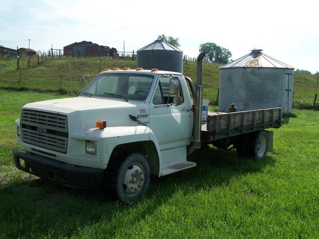 1989 Ford F-700 dsl. truck w/12' steel flatbed w/AT, gooseneck hitch, elect.