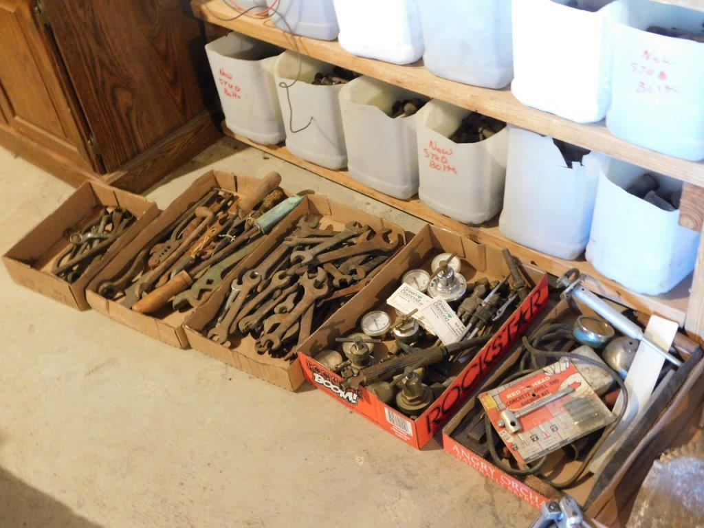 parts storage; hand crank oil container; Winsor chain saw sharpener
